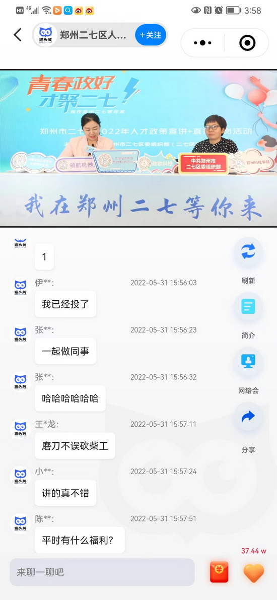 5月31日,公司应邀参加郑州市二七区举办的 “青春政好 才聚二七”暨“人才政策宣讲+直播带岗活动”,我单位人力资源部王涵丰主任参加了此次直播宣讲活动。